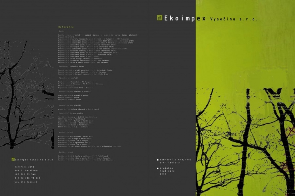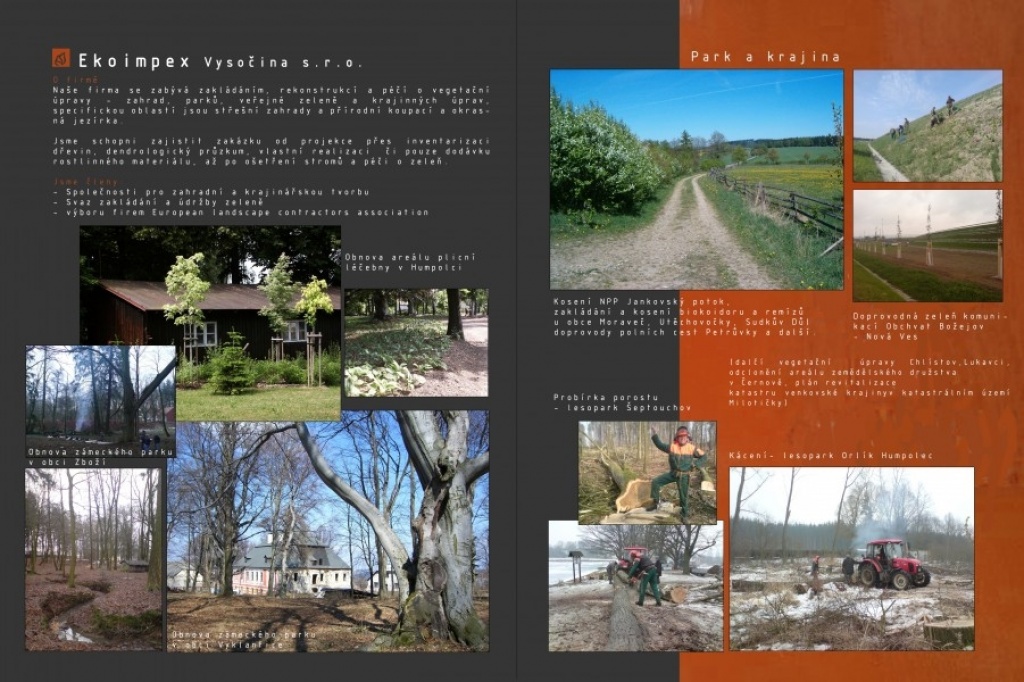Ekoimpex Vysočina s. r. o. je firma, která se zabývá veškerými službami v oblasti krajinářské tvorby, zemědělství a zahradnictví. Specializujeme se na zakládání zeleně, regeneraci zeleně, údržbu zeleně a jsme schopni zajistit zakázku od projekce a projektové dokumentace, založení zeleně, přes inventarizaci dřevin, dendrologický průzkum až po samotnou realizaci a následnou údržbu. Dále nabízíme navážku a dodávku rostlinného materiálu, ošetření stromů, údržbu zeleně nebo vybudování jezírka.