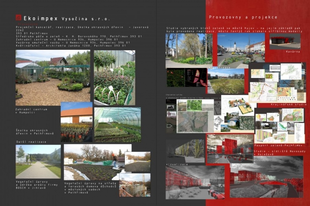 a zakládání zeleně, krajinářská tvorba a jiné služby poskytované v oblasti zemědělství a zahradnictví jsou náplní firmy Ekoimpex s. r. o. Specializujeme se na zakázky u kterých vypracujeme projektovou dokumentaci, provedeme inventarizaci dřevin, dendrologický průzkum, následně vše zrealizujeme a pak poskytujeme údržbu. Kromě jiného se zabýváme službami ohledně regenerace a úprav zeleně, veřejné zeleně, upravíme Vaši zahradu, nebo vybudujeme různá jezírka. Dále dodáváme veškerý rostlinný materiál a provádíme ošetřování stromů.
